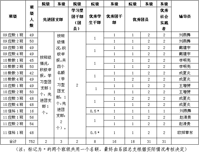 1.各团支部评选院(系)级学习型团支部、院(系)级先进团支部、院(系)级学习型团干部(团员)、院级优秀学生干部、院(系)级优秀团员名额分配如下: