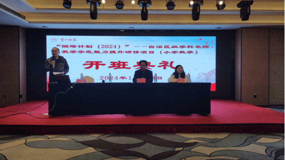 11月19日下午,“国培计划(2024)”—-新疆自治区级学科名师教学示范能力提升研修项目(小学数学)开班典礼在鲸悦酒店举行。来自新疆自治区的50位区级骨干教师参加本次研修,共同开启为期10天的专业成长之旅。湖南第一师范学院数统院党委书记、项目首席专家曾玉华,项目班主任王春利、段十怡,以及全体参训学员出席开班典礼。开班典礼由项目班主任王春利主持。
