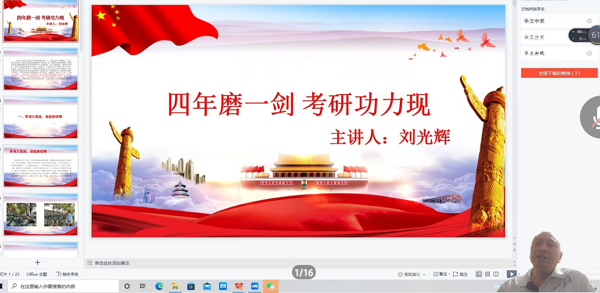 最后,学院曾书记做总结。他高度评价了刘书记的考研辅导工作,感谢他的考研辅导经验交流分享。他指出,希望通过此次讲座,能够进一步激发我院学生的学习热情和考研斗志。今后学院学风建设要以考研为抓手,营造浓厚的学习氛围,教学及学生管理要抓实抓细,充分发挥党建引领示范作用,改进服务,积极推进我院形成良好的学风,提高我院的人才培养质量。