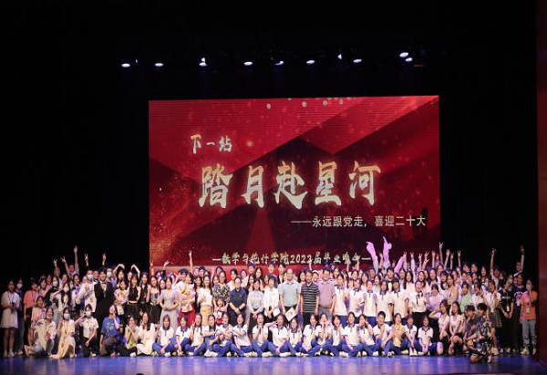 6月1日19时,我院“永远跟党走,喜迎二十大——下一站,踏月赴星河”2022届毕业生毕业典礼暨欢送晚会在田汉剧场隆重举行。校长童小娇教授、副校长蒋蓉教授、研究生处处长欧阳章东教授、学工部副部长成夏炎博士、学院全体党政领导、辅导员和教师代表、优秀毕业生代表以及学生代表共计一千余人观看演出。