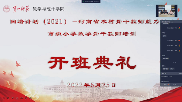 5月25日下午,河南省农村骨干教师能力提升培训项目市级小学数学骨干教师培训班课表在腾讯会议平台举行了开班典礼,项目首席专家、伟德国际1946党委书记曾玉华、项目班主任王春利、邱相炎,班主任助理张茜、何静及全体参训老师参加了开班典礼。开班典礼由班主任王春利主持。