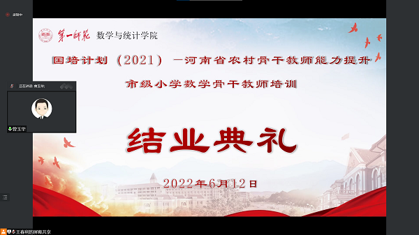 6月12日晚,河南省农村骨干教师能力提升市级小学数学骨干教师培训项目结业典礼通过腾讯会议的形式举行,项目首席专家曾玉华,班主任王春利、邱相炎,班主任助理张莤、何静及全体参训学员齐聚一堂。结业典礼由班主任王春利主持。