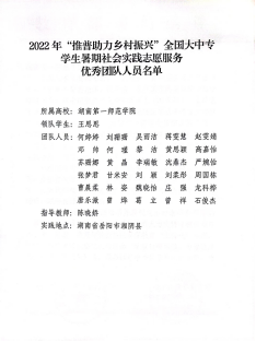 在2022年推普助力乡村振兴”全国大中专学生暑期社会实践志愿服务活动评优工作中,“湖南第一师范学院伟德国际1946赴岳阳市湘阴县金龙镇‘数润星泽’推普助力乡村振兴服务队”荣获优秀团队称号!