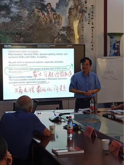 段金桥教授做了题为“最优化方法如何助力于随机动力系统研究”的学术报告,他从计算优化谈起,介绍了最优化与随机动力系统和非线性动力系统的关系,以及优化在随机微分方程中的应用,进一步阐述了随机动力学中最大可能迁移轨道就是确定性最优化问题。段教授生动有趣的报告,给大家留下了深刻的印象。