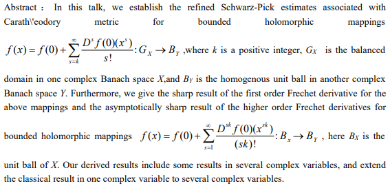 报告题目:A refinement of Schwarz-Pick estimates and Caratheodory metric in several complex variables
