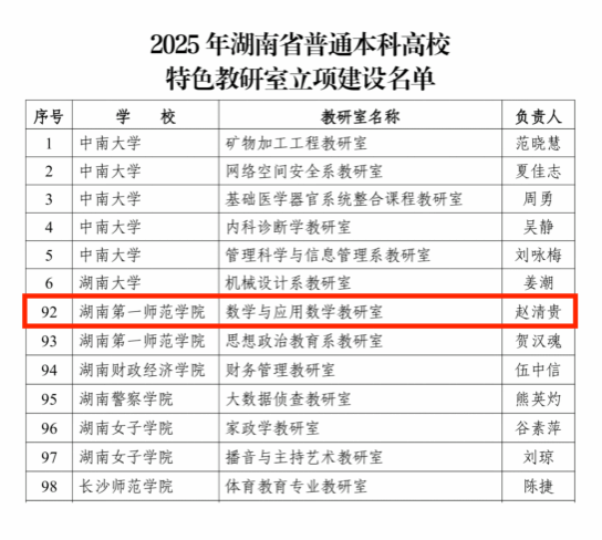 近日,数学与应用数学系作为我校唯一理科组代表,入选2025年湖南省普通本科高校特色教研室拟立项建设名单。