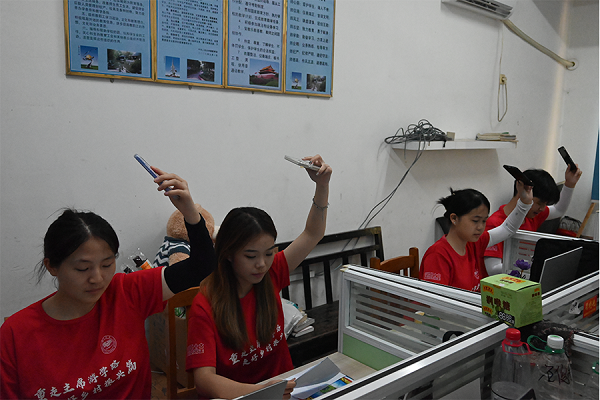图为队员们在教学楼办公室里举着手机寻找网络。中国青年网通讯员张梦君摄