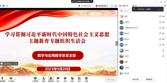 按照学校党委统一部署和数统院党委工作要求,9月20日晚上,数学与应用数学系党支部召开学习贯彻习近平新时代中国特色社会主义思想主题教育专题组织生活会。支部党员全体参会,数统院党委书记曾玉华到会过双重组织生活,此次会议由支部书记赵清贵主持。