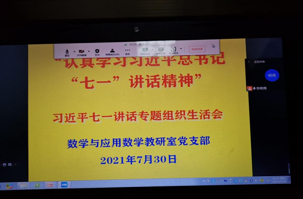 7月30日晚上,我院数学与应用数学教研室党支部通过腾讯会议召开学习习近平总书记“七一”重要讲话专题读书班和专题组织生活会。学院院长、党总支副书记欧阳章东出席会议, 数学与应用数学教研室党支部全体成员参加会议,本次会议由党支部书记李明亮主持。