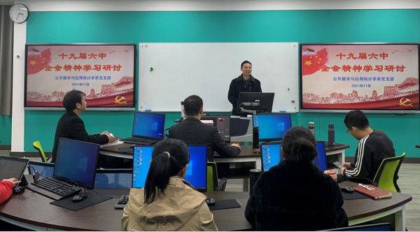 根据学院党委和支部“三会一课”学习教育活动安排,11月30日下午,公共数学与应用统计学系党支部全体党员,在特立北101开展了“中国共产党第十九届六中全会精神学习研讨”主题党日活动。学院党委书记曾玉华和系支部书记李明亮先后讲党课,其他党员同志都积极讨论发言。