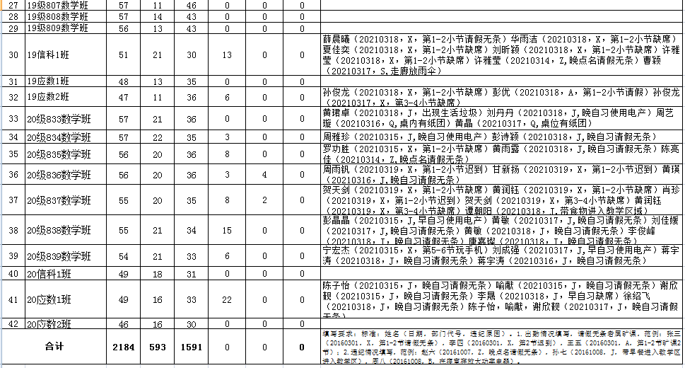 数学与计算科学学院2020-2021学年第二学期第三周考勤表