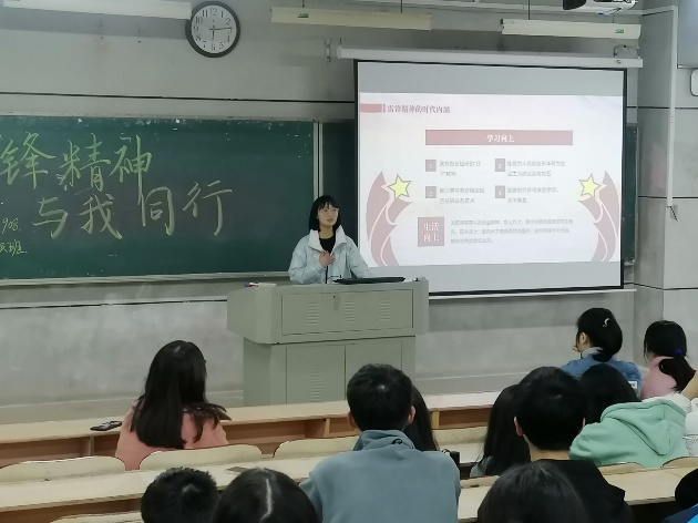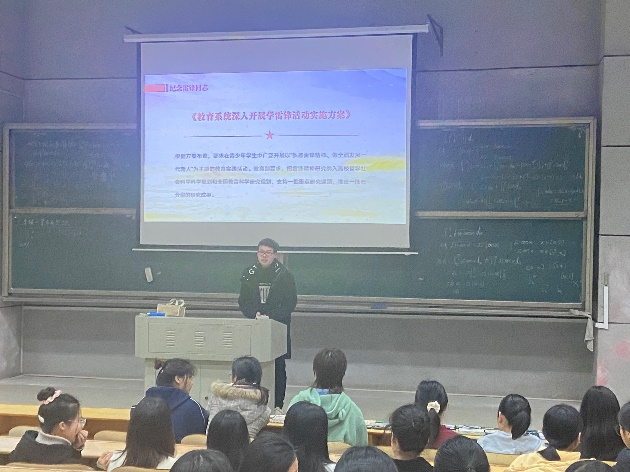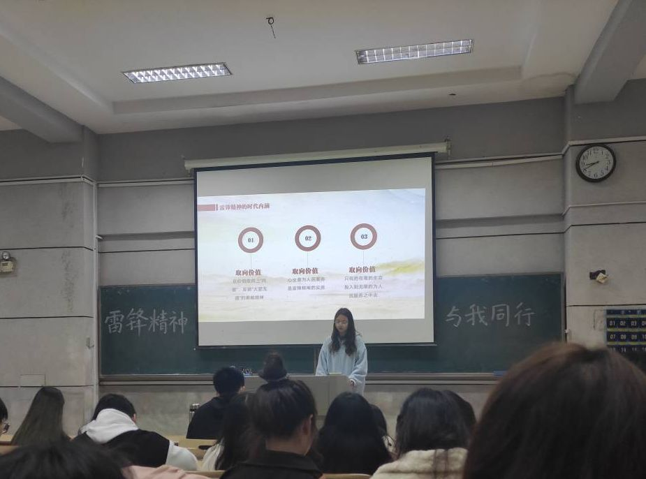 主题班会上,各班团支书以影像、文字为媒介,带领同学们深入学习雷锋精神相关内容,走进雷锋同志的生平,其中包括:什么是雷锋精神、雷锋精神的时代内涵、雷锋精神的具体内容、学习雷锋精神和雷锋精神的重要意义。