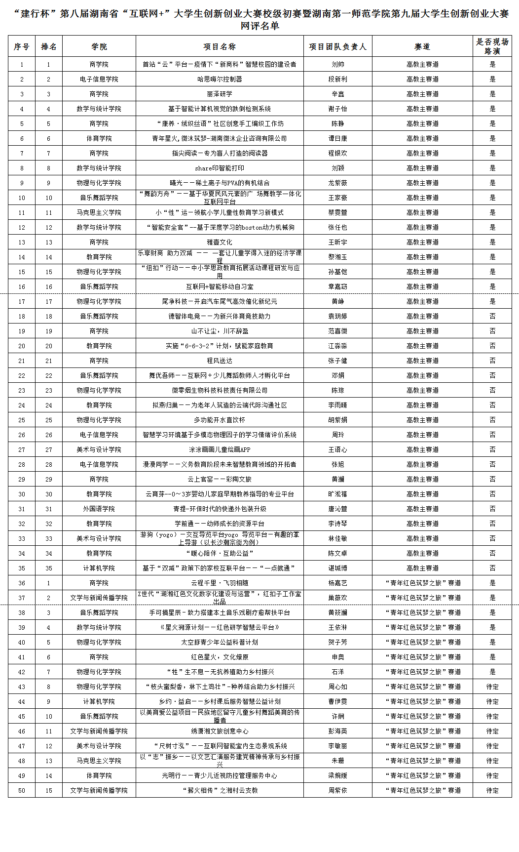 附件:“建行杯”第八届湖南省“互联网+”大学生创新创业大赛校级初赛暨湖南第一师范学院第九届大学生创新创业大赛 网评名单