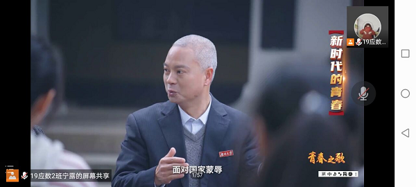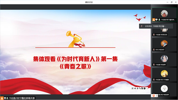 5月13日12:40,数统院学生第二党支部全体同志线上观看思政节目《为时代育新人》第一集《青春之歌》,本次活动由伟德国际1946学生第二党支部副书记宁露主持。
