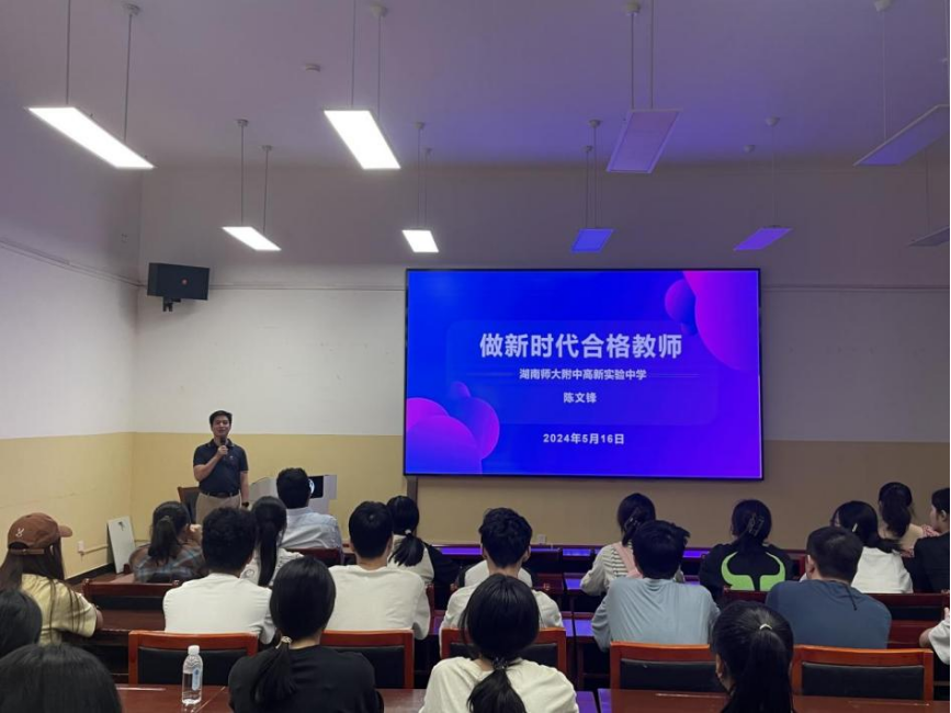 5月16日下午,湖南师大附中高新实验中学陈文锋书记应邀来到伟德国际1946城南书院校区开展“新时代教师必备十大素质”的讲座。讲座由学院副院长王增赟主持,辅导员及23级润之英才班全体学生参与讲座。