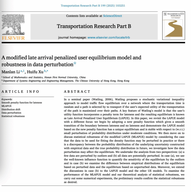 近日,我院教师李满兰与香港中文大学系统工程与工程管理系徐慧福教授合作,在《Transportation Research Part B: Methodological》上发表了题为“A modified late arrival penalized user equilibrium model and robustness in data perturbation”的学术论文。