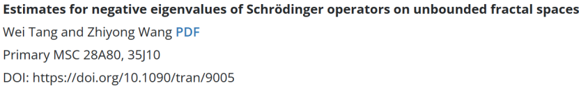 近日,湖南第一师范学院伟德国际1946教师唐微博士与王志勇博士合作在《Transactions of the American Mathematical Society》上发表题为“Estimates for negative eigenvalues of Schrödinger operators on unbounded fractal spaces”的学术论文。