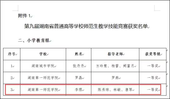 11月4日,第九届湖南省普通高校师范生教学技能竞赛在衡阳师范学院举行,经过激烈的角逐,陈秀琼老师及其带领团队指导的我院20级833数学班李理同学在小学教育组竞赛中荣获一等奖,陈秀琼老师被评为优秀指导教师。